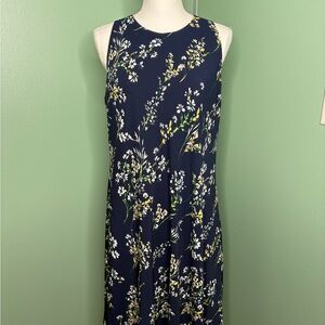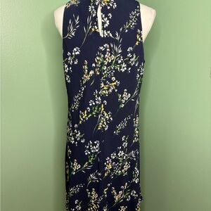 Chic navy dress with floral design. Sleeveless and elegant. Ideal for versatile wear.