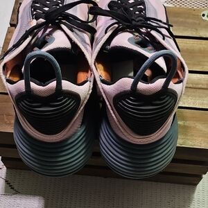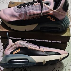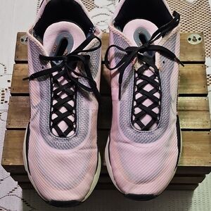 Stylish Nike athletic shoes. Pink upper with black accents. Comfortable and trendy design.