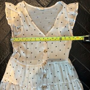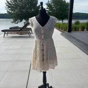 Chic and stylish cream dress with playful polka dots by Altar’d State. Features ruffle sleeves and a button up front.