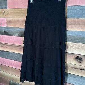 Two-in-one skirt and dress. Features stretch fit smocking to fit a variety of sizes. Wear as a gauzy tiered skirt or a sleeveless summer dress.