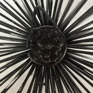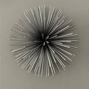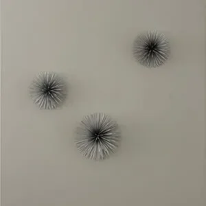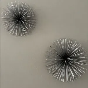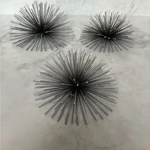 Set of three Retro inspired, Mid Century Modern inspired silver colored metal abstract starburst wall or table art.