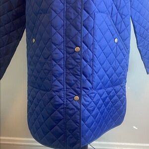 Lands End Women’s Quilted Blue Jacket. Zipper & snap closure. Deep hand pockets with snap closure. Inside collar dark brown corduroy. Snap on both sides waist to snap loose or taper in. Sz XL 18. Like New.