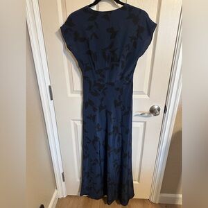 NWOT! In excellent condition. This beautiful Club Monoco dark blue maxi dress with black floral leaf pattern offers a very chic and stylish design and look. Featured a very flattering short cap sleeve & v-neck design and it is all lined. Offers a figure hugging silhouette that flares out a little towards the bottom that makes it ideal for elegant events. Or dress it down with a jean jacket for a day out. This dress is made from soft, comfortable material and is 100% silk. It is the perfect addition to your wardrobe.