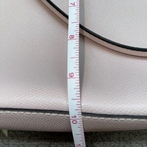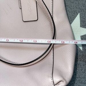 Authentic Coach tote bag crafted from durable pebbled leather in a soft light pink / blush color. The bag has been stored for some time and shows light impression marks on the leather. These marks do not affect the bag’s functionality.