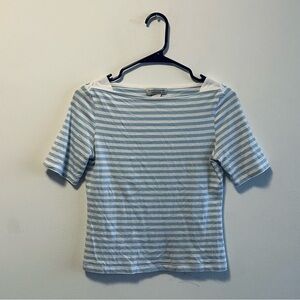 Chic short sleeve tee with light blue and white stripes, and white shoulder detail. Ideal for casual wear.