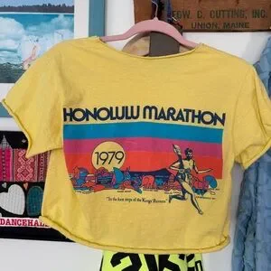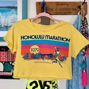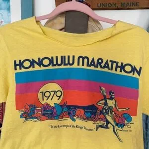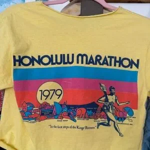 Yellow Honolulu Marathon 1979 graphic tee #running #1970s #thrashed #upcycled #paperthin approx 17 x 17 inches 100% cotton airy soft fit poly tees hawaii amazing graphic on both front and back true 1970s vintage piece
