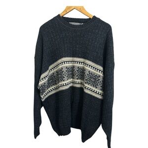 Classic crewneck with a stylish snowflake pattern. Soft and comfortable for everyday wear. Sweater does show signs of wear with some pobbles/fuzz that can be probably removed with a fabric shaver. 100% acrylic.