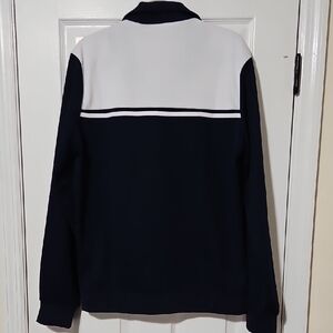 Stylish zip-up sweater by Sergio Tacchini. Features a sleek navy and white design. Ideal for casual wear.