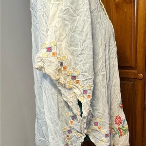 Exquisite detailed colorful floral, geometric, and feather embroidery including at the neckline, and features a scalloped hem and scalloped detail at the sleeves and on both sides from sleeves down to the hem. The top has poncho-like sleeves and then is open sided from about mid-to-lower rib-cage. The top is a pull-over with a v-neck opening with embroidered ties that can be left open or tied.