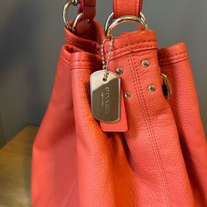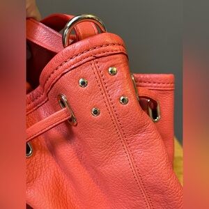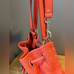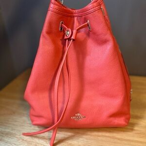 Stylish and versatile, this authentic Coach bucket bag is crafted from premium leather and in excellent condition. Its lovely coral orange color, called Watermelon by Coach, adds a bold touch to any outfit and is great for the season!
