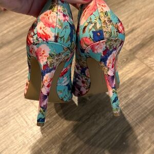 Elegant floral print heels. Vibrant pink and blue design. Perfect for adding flair to any outfit.