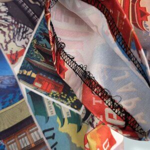 This t-shirt by Fresh Prints of Bel-Air is made of 100% polyester and has short sleeves and a complex print. The print looks like a stack of stamps laid over one another, each saying "JAPAN" over an image of attractions. The shirt is colourful and the neck is accented in black. The shirt has some wear, but no issues affecting wearability. It's worth mentioning that one of the sleeves has some wild extra threads, but that appears to be an issue caused during manufacture and shouldn't come unstitched.