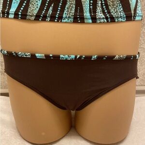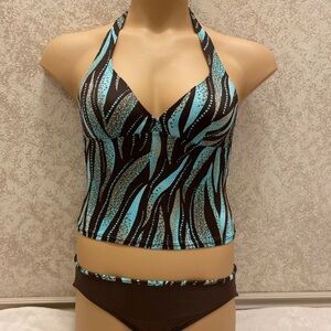 Colors are a chocolate brown background with a seagrass print in aqua, olive, brown, and white. Tank hooks behind the neck. It has thinly padded cups however they have a little bit of crinkling from storage. The bottoms are brown with a seagrass print along the top edge. There is some pilling on the seat. The manufacturer has this llisted as a size 8, which is typically a medium, but I feel like it’s a little on the smaller side. Measurements are included to help you ensure a proper fit🩵 sold as pictured. Color may vary, depending upon your screen settings. May wrinkle during shipping.🤎Bin-7B-3