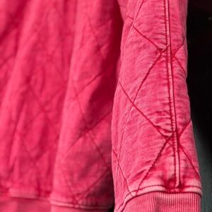 Vibrant pink pullover with quilted texture. Features a stylish half-zip design.