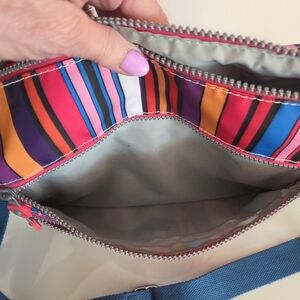 Sage lined interior. Teal blue adjustable canvas crossbody strap. Interior key chain holder. Very minor scratch on the front as per photo. Monkey key chain not included.