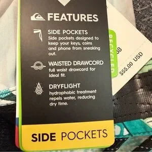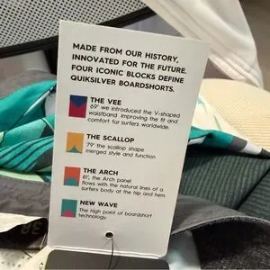The NWT QUIKSILVER SZ 38 x 18 Men’s Board shorts are perfect for a day at the beach, resort or any other vacation adventure. These gray, white and teal polyester board shorts feature practical pockets, two front pockets one back pocket with Velcro closure. Front closure is Velcro with a drawstring. These shorts are designed for regular sizing and come from the trusted brand QUIKSILVER known for their quality swimwear and are perfect for those looking for durable and stylish swim bottoms for a day of fun in the sun.