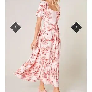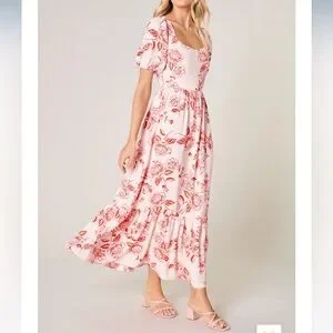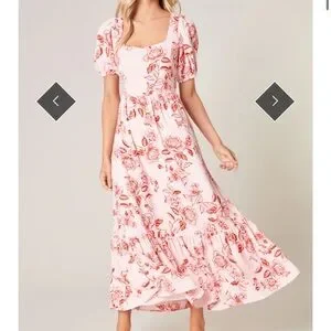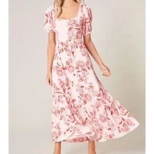 Dance the day away in this darling midi dress covered in a bold outlined peony print. Short puff sleeves frame a sweetheart neckline and fitted bodice. A high waist features shirring at the seams and flows into a single tier flouncy midi skirt. The back has a tie detail to hold the dress in place. Pair the look with pink or white heels for a completed look.
