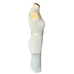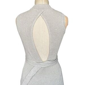 Features a turtle neck. Sleeveless. Wrap belt with double D-ring fastening. Open back. All-over ribbed finish. 100% cotton. Hand wash or dry clean. Wash inside out.
