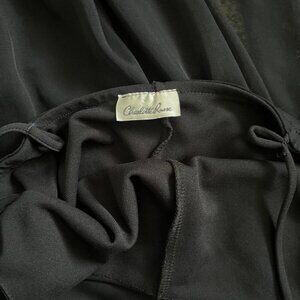 90s vintage draped pantsuit by Charlotte Russe. Such a unique piece and would be perfect for prom or a semi-formal event! Black camisole strap jumpsuit with straight leg pants and a sheer mesh dress/skirt overlay with ruching at the waist. Also has little silver studs sprinkled across the bodice for extra sparkle✨ modest and cute!! The straps have been taken in approx. an inch and could be let out if needed :)