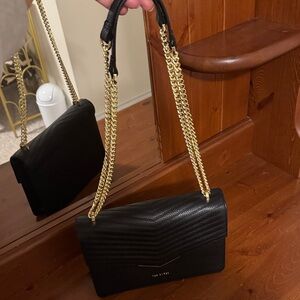 Chic black shoulder bag. Features elegant gold chain strap. Perfect for versatile styling.