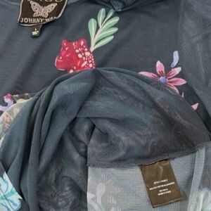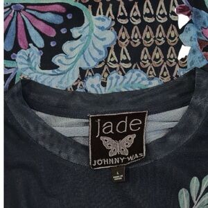 Jade Johnny Was Natalie 3/4 Sleeve Mesh Top with Peacock Floral Blouse Navy Sz L
