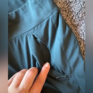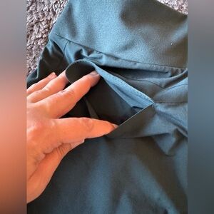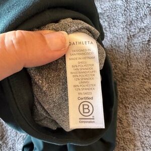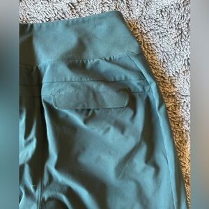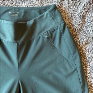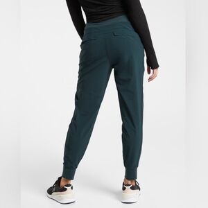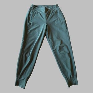 These Athleta track pants in a rich green hue offer a relaxed, tapered fit with elastic cuffs for a modern look. Crafted from a smooth, technical fabric, they provide both comfort and functionality, making them ideal for workouts or casual wear.