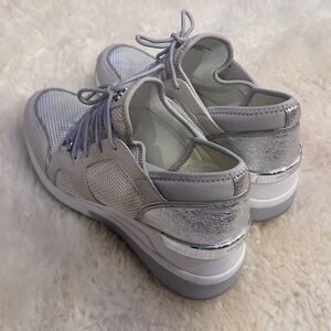 Gorgeous sneaker with shinny silver detailing. Worn once or twice. They are in excellent condition. Absolutely nothing wrong with them, I just have more shoes than I can realistically wear.