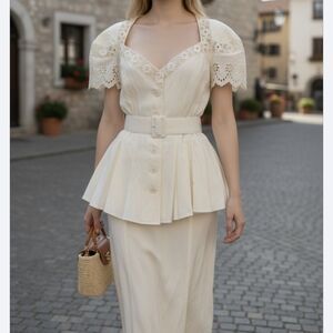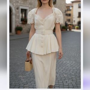 Karen Alexander Vintage Elegant Cream Lace Peplum Set Top+ Skirt