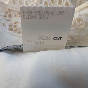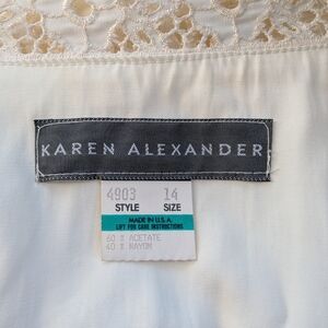 Karen Alexander vintage white peplum dress, likely from the late 1940s or 1980s. The style, featuring a structured peplum, short sleeves, lace details, and a buttoned front bodice, was popular in both eras.