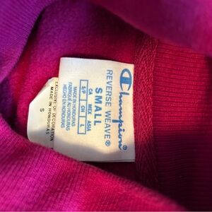 Bright fuchsia sweatshirt by Champion. Features iconic logo. Ideal for casual wear.