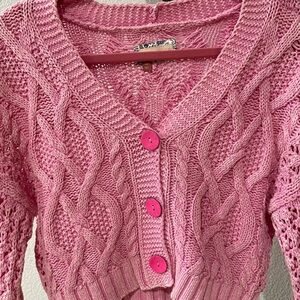Pretty in Pink! 🩷 Chic pink cardigan with cable knit design. Features button-up front. Ideal for layering.