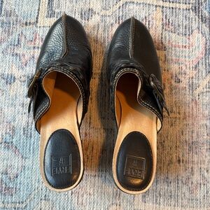Frye Candice women’s black leather mules/clogs with braided strap buckle detail. Great gently used condition, and Frye shoes are made to last. Comfortable rubber sole for everyday wear. Heel: 3”, Platform: .75”