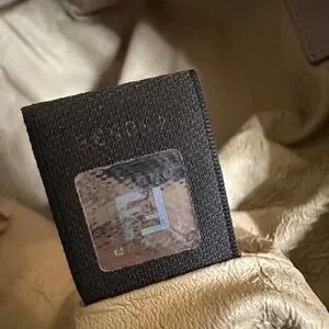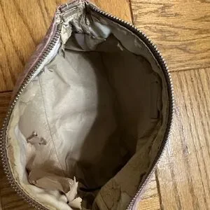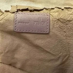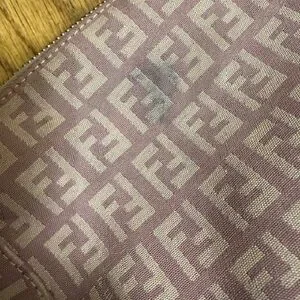 Fendi mauve cosmetic bag with iconic monogram design and zipper. Inside leather lining is peeling. There is a spot of discoloration on bag - can probably be cleaned (please see photo).