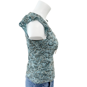 Y2K DressBarn early 2000s McBling, ethereal Whimsygoth aesthetic, this piece is a must-have for any curated vintage collection. This top is a Size Small and features a stunning, multi-tonal teal and aqua lace overlay with a delicate paisley-inspired swirl pattern.