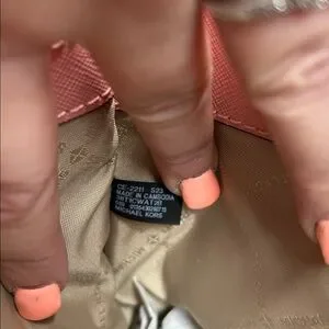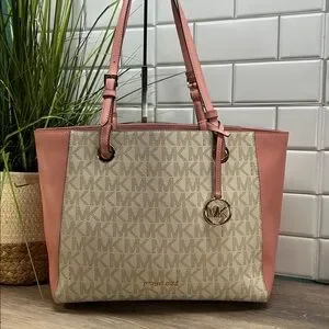 Stylish Michael Kors tote with signature MK pattern. Pink leather accents. Spacious interior. Perfect for everyday use.