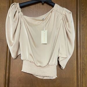Stylish asymmetrical blouse with gathered sleeves. Soft cream fabric. Ideal for elegant occasions.