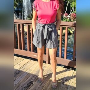Black/ Gray Linen Look paper bag shorts with waist belt. Dress them up with heels or wear them with flats, these are the perfect length and weight for a day on the go.
