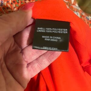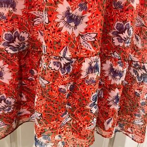 Beautiful Sam Edelman long sleeve dress with vibrant floral design. Red/orange hue for back ground color, long sheer sleeves, ruffle at bottom and tie at the waist The floral colors are mostly white and purple. Ideal for stylish outings.