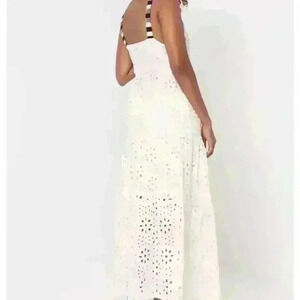 Swiss embroidery with sequins for a touch of shimmer and contrasting stripy straps. Maxi dress made from 100% cotton with a subtle A-line cut.