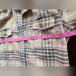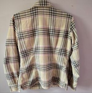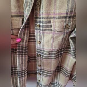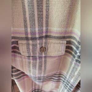 Pattern: Classic plaid in a unique colorway of Tan/Oatmeal with Lilac/Lavender and Charcoal Grey accentsStyle: Button-down front with two chest button-flap pockets.
