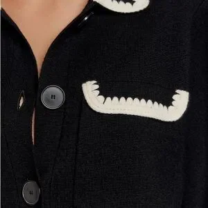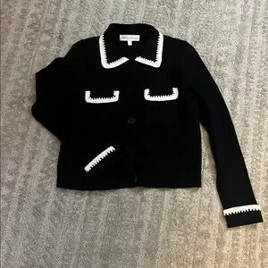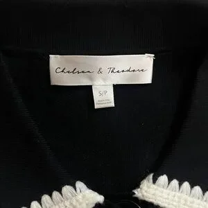 Chelsea & Theodore Black Cardigan with Knit Embroidered White Trim Details Small