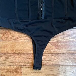 Chic black mesh bodysuit with off-shoulder design. Features a front zipper and fitted silhouette. Ideal for stylish outings.