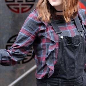 ✨NWT Zara Gray Red Plaid Flannel Long Sleeve Ruffle Trim Blouse Top Size XS