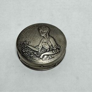 Vintage Norida Vanitie powder refillable makeup compact with mirror. Silver-colored metal compact is from the 1920s and features a woman flowers on the front. Compact opens and has a refillable sifter component (compact is empty and does not include makeup). There is some tarnish on the compact due to age and is sold as is.