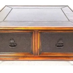Enhance your home office with this elegant brown wooden desk featuring black accents. Its classic design adds sophistication to any workspace.
