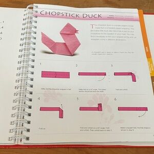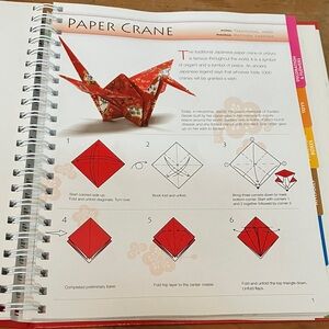 Good used condition, includes paper (may be missing a couple sheets of loose paper) color illustrations includes instructions on making dinosaurs, geometric shapes, animals, practical boxes, toys, decoration, and flowers and traditional origami. Lots of fun for adults and kids alike.
