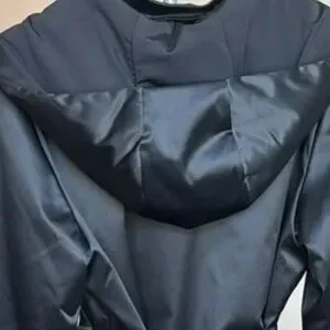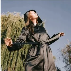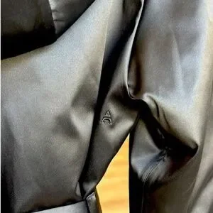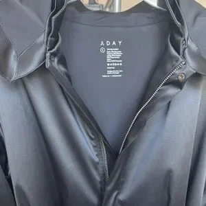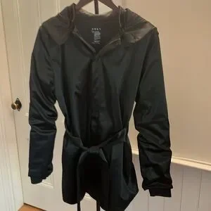 Sleek black ADAY trench coat with beautiful satin shine in excellent condition.