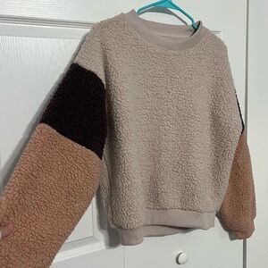 Cozy sherpa sweatshirt with colorblock design. Features cream body with brown and tan sleeves. Perfect for casual wear.