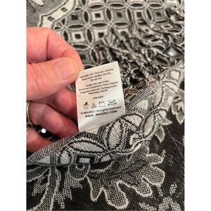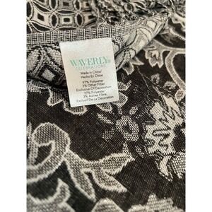 Wrap yourself in elegance with Waverly's stunning black paisley pashmina shawl. This multifunctional accessory is perfect for adding a touch of sophistication to any outfit. Whether you're attending a formal event, enjoying a casual day out, or simply need an extra layer of warmth, this shawl is your go-to choice. Made from a blend of polyester and other fibers, it offers a luxurious feel and versatile style. Measuring 66 inches in length and 27 inches in width, it drapes beautifully. In pre-owned condition, it still promises to be a cherished addition to your wardrobe.
