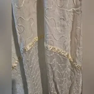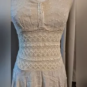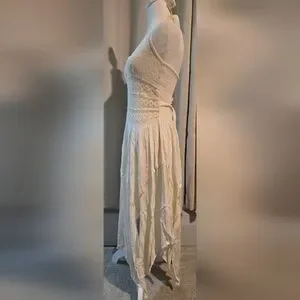This elegant cream halter dress is perfect for any occasion. Its flowing design and delicate details offer a sophisticated look. This dress is appropriate for a women's size medium or smaller. The mannequin is a woman's 4-6.